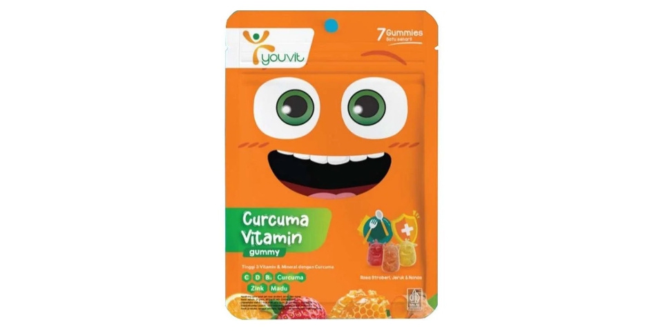Youvit hadir dalam bentuk gummy yang menarik, lengkap dengan kombinasi vitamin C, D, A, zinc, serta curcuma dan madu. Selain membantu menambah nafsu makan, vitamin ini mendukung pertumbuhan tulang dan imunitas.
