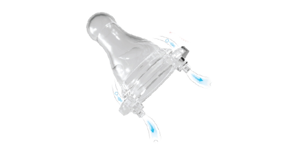 Dot ini mampu mendorong proses menyusui secara tegak lurus sehingga mengurangi risiko aliran balik ASI yang menyebabkan komplikasi di tengah telinga. Terbuat dari silikon berbentuk elips meniru payudara ibu, dot ini bisa mensimulasikan pengalaman pelekatan yang nyata. Ventilasi udara anti-kolik yang terpasang di dalamnya mengurangi asupan udara yang tidak diinginkan.