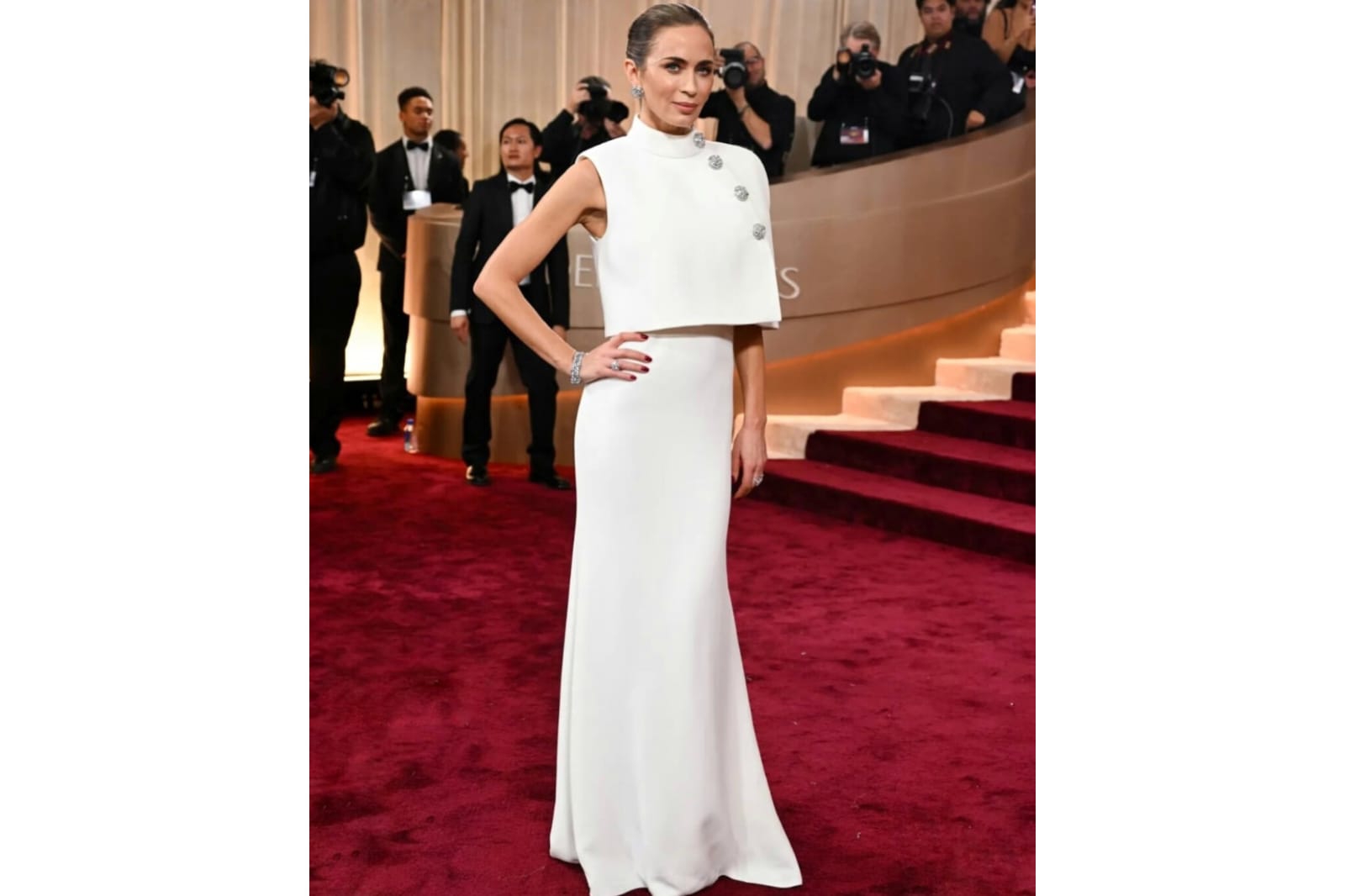 5. Sudah tak asing lagi bila melihat selebriti yang hadir di red carpet Golded Globes akan mengenakan busana yang mewah, seperti Emily Blunt yang memilih mengenakan gaun putih dengan cape di bagian bahu, tetapi juga memiliki cutting tanpa lengan di salah satu bagian sisi lengannya serta kancing perhiasan perak yang membuat penampilannya terlihat mahal dan memesona. Gaun yang ia kenakan ini merupakan karya Louis Vuitton.