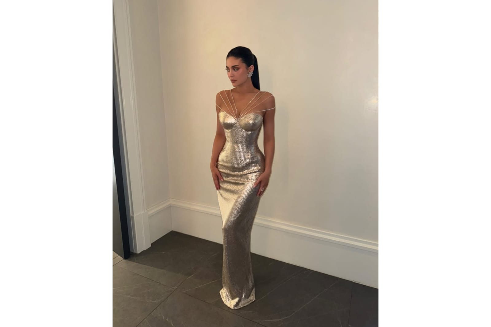 8. Penampilan Kylie Jenner saat hadir di Golden Globes 2026 sukses mencuri perhatian banyak orang. Ibu dua orang anak ini mengenakan gaun berwarna emas metalik karya Ashi Studio. Potongan fit body dari gaun ini memperlihatkan lekuk tubuh Kylie. Tak hanya itu, detail tali pada bagian bahu dan dadanya juga makin membuat penampilan Kylie makin menawan. Belum lagi dengan perhiasan berlian yang menghiasi telinga dan tangannya, membuat penampilannya terlihat mewah.