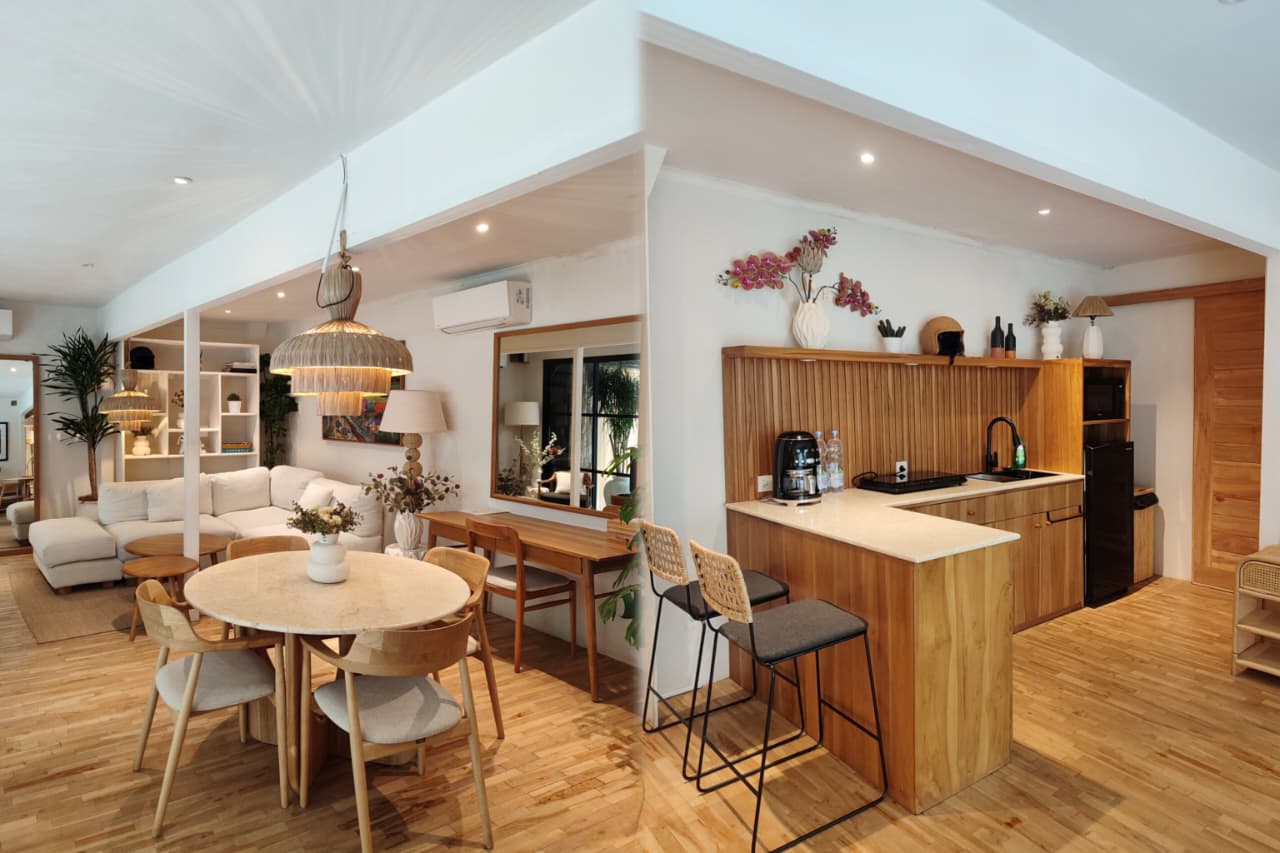 Usai terpana dengan bagian luar vila, saya pun akhirnya masuk ke dalam vila. Kecantikan bagian dalam vila ini sebenarnya sudah dapat terlihat karena konsep pintu berkaca yang memudahkan kita untuk melihat rupa di dalam vila. Nyatanya, vila ini memang didesain stylish. Konsep minimalis dengan menggunakan sebagian besar furnitur natural membuat vila ini terasa cozy. Vila ini juga mengusung konsep open-plan (minim sekat) untuk living room, dining room, dan dapur, sehingga ruangan terasa lebih luas.