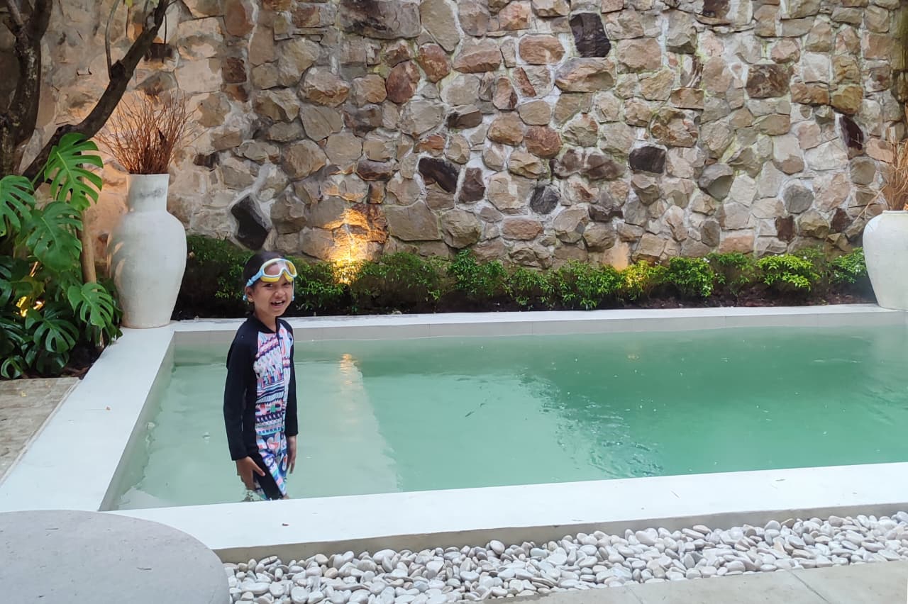 Ketika masuk, mata saya langsung dimanjakan dengan tampilan bangunan dua lantai bergaya tropis dengan suasana yang santai dan hangat. Mata saya pun melirik kolam renang pribadi yang terletak di depannya. Rasanya tak sabar ingin segera berenang, meski saat itu langit sedang hujan. Saya sudah membayangkan, bila akhirnya tak sempat berenang, sekadar duduk manis saja di kursi rotan yang nyaman ditemani secangkir teh hangat, dengan memandang sekeliling vila ini saja sudah cukup menyenangkan.
